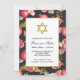 These beautiful Passover Seder invitations have a very dark grayish blue background (almost black), with a lovely watercolor pattern featuring pomegranates and flowers. A faux gold frame and Star of David is in the centre, and you can easily personalise the invitation wording.