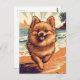 Colourful graphic art design of a pomeranian at a tropical beach with palms. Awesome gift for Pomeranian owner and Pomeranian lover.