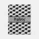 This custom fleece blanket features a silhouette of a Pomeranian dog tiled in the background and place for a name in the centre.