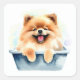 Cute dog watercolor illustration of a happy fluffy Pomeranian dog in a bathtub. Great for dog lovers.