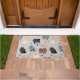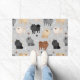 Cute Pomeranian dogs in black, grey, cream, chocolate and red coats sit and stand with scattered dog bones and paw prints on a light grey background.