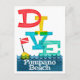 Colourful Pompano Beach Florida scuba design. Retro typography in inkpress style with the word "Dive", along with a scuba flag floating in the ocean.