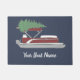 Create some custom holiday decor for your home or your boat. This personalised doormat has an illustration of a red and white pontoon boat with a green Christmas tree strapped to the top set against a blue background. It's ready to be personalised with your boat's name in white script lettering.