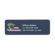 Add a nautical touch to your Christmas cards with these return address labels. They feature an illustration of a pontoon boat in red and white with a Christmas tree strapped to the top. The graphic is set against a blue background with your name and address to the side in white lettering.