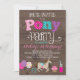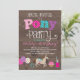 Our adorable Pony Birthday Party Invitation features a woodgrain background, bold, fun pattern letters and adorable horseback riding graphics along the bottom such as a pony, horseshoe, balloons, cupcake, and party drink! This is the perfect invitation for your child's pony theme birthday party!