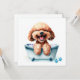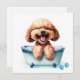 Cute dog watercolor illustration of a happy fluffy curly brown poodle dog in a bathtub. Great for dog lovers.