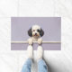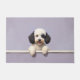 The soft lavender gray background adds a modern and sophisticated touch, perfect for welcoming entryways. Designed with extra space at the top and bottom, it allows easy personalization with names, welcome messages, or custom text—making it ideal for unique dog-themed doormats and thoughtful gifts.