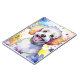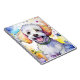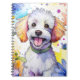 A digital art image of a poodle dog with fluffy white fur and orange-tinted ears. Its pink tongue is out, and the background is splattered with lively hues.