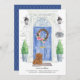 Announce your new address with our stylish announcement featuring a poodle, blue front door, welcome mat, slate sign, topiaries and a floral wreath set on a grey brick background.
