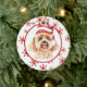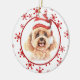 On the front of this Holiday ornament is a beautiful watercolor image of a poodle dog wearing a red and white striped Santa hat. The image is placed on a white circle framed by a retro red snowflake pattern. The back of the ornament has the same background and circle with your custom text in white on a matching red background. Cute, especially for someone who loves a Poodle.