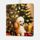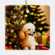 This Christmas ornament features a white poodle sitting under a Christmas tree.