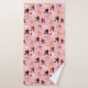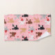Cute Valentine's Day Poodles with in black, white, gray, apricot and brown color coats wearing red, pink, and white polka dot and heart sweaters with scattered paw prints and arrow on a pink background.