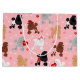 Cute Valentine's Day Poodles with in black, white, grey, apricot and brown colour coats wearing red, pink, and white polka dot and heart sweaters with scattered paw prints and arrow on a pink background.