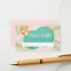 This baby shower diaper raffle ticket features a turquoise blue coloured pool with a salmon red inner tube, and a salmon red umbrella and beach chairs under the palm tree leaves on a light pink background. The reverse side features a light pink background with sand beige stripe background. Change the background colour of both the front and the back, and personalise it for your needs. You can find more matching products at my store.