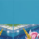 A cute young girl gently drifts on a pink and white unicorn float, gliding across a crystal-clear, blue swimming pool.