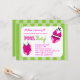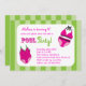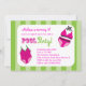 Fun and cute pool party birthday invitation. Great for a girl. Features two swimsuits in pink, green and black with a stripes background. Modern and colourful invitation.