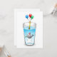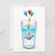 Pool party birthday invitation with a cute illustration of a little whale. The whale is wearing a red and white striped party hat and has started the birthday party which takes place in a filled water glass.