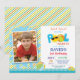 Pool Party Birthday Invitation with custom photo. Summer Splish Splash. Boy Birthday Party Invite. Beach Ball. Swimming. Swimsuit. Birthday Bash. Blue Red Yellow Orange Green Stripes. White Background. 1st First Birthday. 1st 2nd 3rd 4th 5th 6th 7th 8th 9th 10th 11th 12th 13th 14th 15th, Any Age. Printable Digital. For further customisation, please click the "Customise it" button and use our design tool to modify this template.