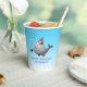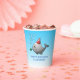 Pool party birthday paper cups with a cute illustration of a little whale. The whale is wearing a red and white striped party hat and has started the birthday party in the pool.