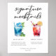 This chic pool party or coastal wedding signature mocktails menu poster features simple script above 2 cool drinks and their ingredients for your tropical island celebration. A cute non-alcoholic Blue Lagoon drink and Shirley Temple drawing for a refreshing summer reception. Complete with the couple's names and date.