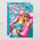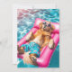 Golden retriever floating on a pink air mattress in a swimming pool water for a summer pool party.