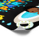 Cute party sign for children featuring Pool party splash art, dark skinned curly haired boy and some pool party equipment.
