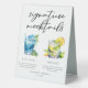This chic poolside signature mocktails table tent sign features simple script above 2 beach wedding or pool party drinks and their ingredients for your coastal celebration. A cute Blue Lagoon drink and Mint Julep drawing for a refreshing summer reception. Complete with the couple's names and date.