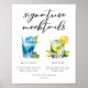 This chic poolside signature mocktails poster features simple script above 2 beach wedding or pool party drinks and their ingredients for your coastal celebration. A cute Blue Lagoon drink and Mint Julep drawing for a refreshing summer reception. Complete with the couple's names and date.