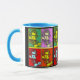 The mug has a blue handle and a blue interior, with a black exterior band where the images are printed.