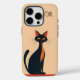 A black and red cartoon cat, in a mid-century modern style, siting on a red shelf or floor, against a peachy background, creates a charming iPhone case. Perfect for anyone who loves cats.