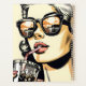 Pretty comic book pop art retro pretty lady drinking soda with sunglasses on with a sunset reflection.