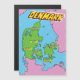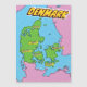 A stylised map of Denmark in a pop art style, featuring a green outline of the country against a blue and pink dotted background. The map highlights major cities with yellow rectangular labels, including Aalborg, Aarhus, Esbjerg, Odense, Copenhagen, and Lolland.