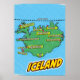 A pop art style map of Iceland with a bright blue background and a dotted pattern. The map itself is green with black outlines and features various cities and towns marked with red dots and yellow speech bubbles. The names of the cities are written in bold white letters inside the speech bubbles.