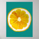 A cute and colorful vibrant yellow lemon fruit slice from an original painting by artist Sacha Grossel. This large pop art style fruit is yellow and very bright and colorful against a customisable blue teal colored background. Quirky and original.