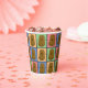 Fun colourful paper party cups style mouse pad with a pattern of different coloured rectangles each with a happy brown potato in the middle.