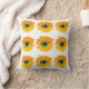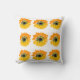 Festive yellow and orange pop art sunflower throw pillow with 9 sunflowers on the front side and a plain yellow/orange back side.
