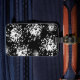 A black and white creation of a white flower. This unique luggage tag should be easy to identify your suitcase at baggage claim.