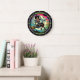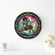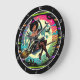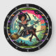 This vibrant Halloween wall clock features a stylish, dark-skinned witch with an afro, flying on her broomstick against a bright pop art backdrop with a full moon and bats. With bold colours and a unique retro aesthetic, it's a fantastic and eye-catching addition to your spooky season decor. Edit colour of the clocks numbers in the Design tool to your favored colours.