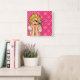 A vibrant clock design featuring a cheerful woman with voluminous blonde curls, set
