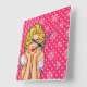 against a playful pink polka dot background. Her expression is one of joy and charm, with hands resting on her cheeks.