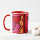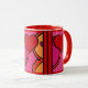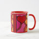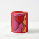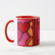 What Fun! There is just something so happy and light-hearted about the design on this great ceramic mug, that makes it impossible not to smile! Leslie Sigal Javorek's original artwork is in an abstract, pop-art style featuring ketchup-red hearts and bright, warm tones of hot pink, orange and black outlines against bright white porcelain.
