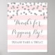 Thanks for popping by popcorn bar sign poster for baby shower, bridal shower, or wedding in light blush pink and white stripes pattern with silver glitter effect confetti, please note silver is photographic effect only. Perfect for a baby shower, wedding, or bridal shower.