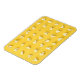 This design features popped popcorn kernels arranged in a neat grid on a yellow background. One kernel is only half popped.