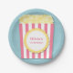 Party supplies of paper plates to match that movie night party or carnival themed birthday party! It features a big packet of popcorn with the packet in the pastel red and white stripes with a scallop edge space in the centre for a personalised message. Design is treated with shadow effect to make the design look three dimensional. Background of polka dots pattern.