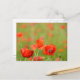 Postcard of vibrant red poppy flowers in a green field full of poppies. It has a strong emotion of hapiness, spring and summer.