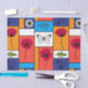 Colourful boxes and hand drawn poppies, daisy and butterfly, seamless vector pattern