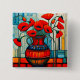 A.I. created interpretation of vibrant red poppies are presented in a stylized fashion, blooming from a striped brown and blue vase against a background composed of geometric surreal shapes.