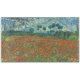 Poppy Field by Vincent Van Gogh, oil on canvas 1890, is a landscape painting of vast fields of brilliant red poppy flowers stretching to the distant tree lines and rolling hills. Busy, swirling, thickly and vigourously applied brush strokes of contrasting and complementary colours lead the viewer’s eye ceaselessly around the composition, giving a feeling of both appreciation of natural beauty and great disturbance. Points of purple-violet and other colours define other flowers in the foreground as well as the rounded tree tops that intersect the swirling sky at the edges of the field.