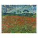 Poppy Field by Vincent Van Gogh, oil on canvas 1890, is a landscape painting of vast fields of brilliant red poppy flowers stretching to the distant tree lines and rolling hills. Busy, swirling, thickly and vigourously applied brush strokes of contrasting and complementary colours lead the viewer’s eye ceaselessly around the composition, giving a feeling of both appreciation of natural beauty and great disturbance. Points of purple-violet and other colours define other flowers in the foreground as well as the rounded tree tops that intersect the swirling sky at the edges of the field.