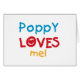 Poppy Loves Me T-shirts, cards, stickers, bodysuits bags, and more with colourful red, yellow, and blue text and heart design. These Poppy Loves me apparel and gift items will make poppy smile!